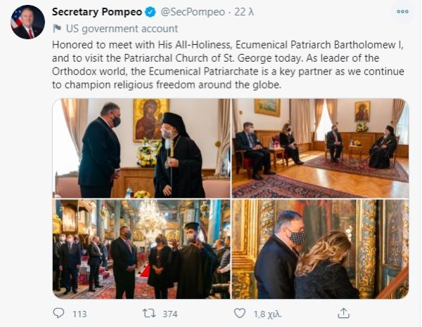 Το τουίτ Πομπέο μετά τη συνάντηση στο Φανάρι
