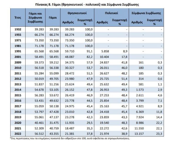 Στα θετικά είναι οι αυξητικοί δείκτες στους γάμους. Το ανησυχητικό, ωστόσο, είναι ότι ο πολιτικός γάμος υπερτερεί του θρησκευτικού. Αναλυτικότερα, οι γάμοι το 2022 ανήλθαν σε 43.355 (21.381 θρησκευτικοί και 21.974 πολιτικοί) παρουσιάζοντας αύξηση κατά 6,4% σε σχέση με το 2021, κατά το οποίο είχαν πραγματοποιηθεί 40.759 (18.487 θρησκευτικοί και 22.272 πολιτικοί).