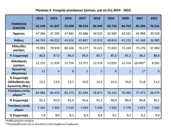 Σύμφωνα με τα παραπάνω, οι γεννήσεις στην Ελλάδα κατά το 2022 ανήλθαν σε 76.541 (39.558 αγόρια και 36.983 κορίτσια) καταγράφοντας μείωση κατά 10,3% σε σχέση με το 2021 που ήταν 85.346 (43.998 αγόρια και 41.348 κορίτσια). Στις γεννήσεις δεν συμπεριλαμβάνονται οι γεννήσεις νεκρών βρεφών, οι οποίες κατά το 2022 ανήλθαν σε 446, μειωμένες κατά 1,5% σε σχέση με το 2021 που ήταν 455.