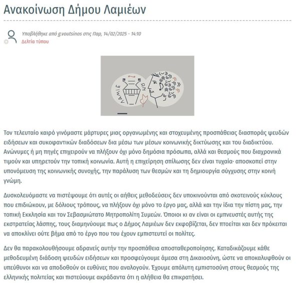 Με ανακοίνωσή του ο Δήμος Λαμιέων καταδικάζει κάθε μεθοδευμένη διάδοση ψευδών ειδήσεων και προσφεύγει άμεσα στη Δικαιοσύνη, ώστε να αποκαλυφθούν οι υπεύθυνοι και να αποδοθούν οι ευθύνες που αναλογούν. όπως αναφέρει, “σκοτεινοί κύκλοι επιδιώκουν, με δόλιους τρόπους, να πλήξουν όχι μόνο το έργο μας, αλλά και την ίδια την πίστη μας, την τοπική Εκκλησία και τον Σεβασμιώτατο Μητροπολίτη Συμεών“.