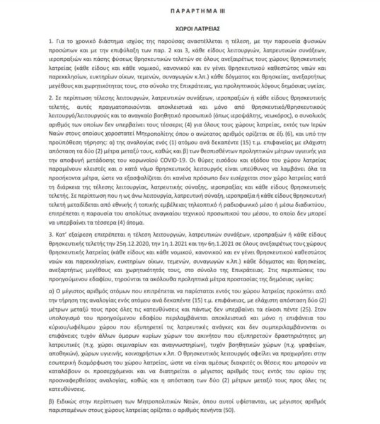3. Κατ’ εξαίρεση επιτρέπεται η τέλεση λειτουργιών, λατρευτικών συνάξεων, ιεροπραξιών ή κάθε είδους θρησκευτικής τελετής την 25η.12.2020, την 1η.1.2021 και την 6η.1.2021 σε όλους ανεξαιρέτως τους χώρους θρησκευτικής λατρείας (κάθε είδους και κάθε νομικού, κανονικού και εν γένει θρησκευτικού καθεστώτος ναών και παρεκκλησίων, ευκτηρίων οίκων, τεμενών, συναγωγών κ.λπ.) κάθε δόγματος και θρησκείας, ανεξαρτήτως μεγέθους και χωρητικότητάς τους, στο σύνολο της Επικράτειας.