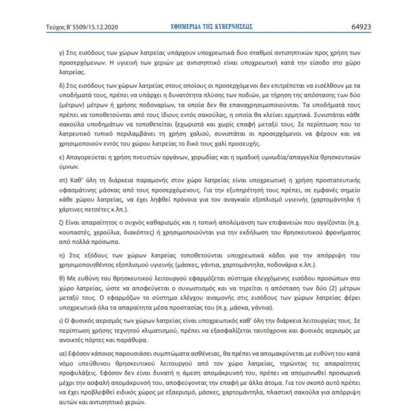 ι) Ο φυσικός αερισμός των χώρων λατρείας είναι υποχρεωτικός καθ’ όλη την διάρκεια λειτουργίας τους. Σε περίπτωση χρήσης τεχνητού κλιματισμού, πρέπει να εξασφαλίζεται ταυτόχρονα και φυσικός αερισμός με ανοικτές πόρτες και παράθυρα.