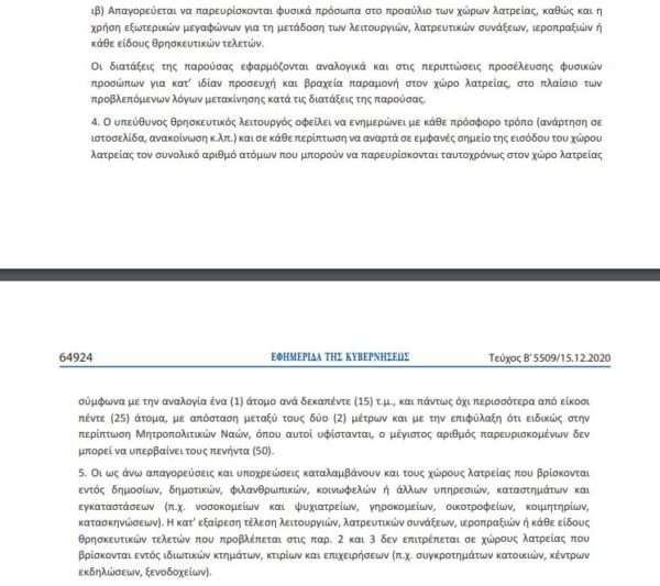 5. Οι ως άνω απαγορεύσεις και υποχρεώσεις καταλαμβάνουν και τους χώρους λατρείας που βρίσκονται εντός δημοσίων, δημοτικών, φιλανθρωπικών, κοινωφελών ή άλλων υπηρεσιών, καταστημάτων και εγκαταστάσεων (π.χ. νοσοκομείων και ψυχιατρείων, γηροκομείων, οικοτροφείων, κοιμητηρίων, κατασκηνώσεων). Η κατ’ εξαίρεση τέλεση λειτουργιών, λατρευτικών συνάξεων, ιεροπραξιών ή κάθε είδους θρησκευτικών τελετών που προβλέπεται στις παρ. 2 και 3 δεν επιτρέπεται σε χώρους λατρείας που βρίσκονται εντός ιδιωτικών κτημάτων, κτιρίων και επιχειρήσεων (π.χ. συγκροτημάτων κατοικιών, κέντρων εκδηλώσεων, ξενοδοχείων).