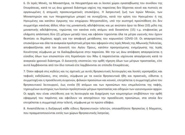 6. Οι Ιερές Μονές, τα Μοναστήρια, τα Ησυχαστήρια και οι λοιποί χώροι εγκαταβίωσης του συνόλου της Επικράτειας, κατά το ως άνω χρονικό διάστημα ισχύος της παρούσας δεν δέχονται κοινό και πιστούς σε οργανωμένες ή ατομικές προσκυνηματικές επισκέψεις.