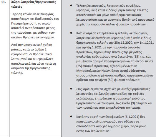 3. Κατ’ εξαίρεση επιτρέπεται η τέλεση λειτουργιών, λατρευτικών συνάξεων, ιεροπραξιών ή κάθε είδους θρησκευτικής τελετής την 25η.12.2020, την 1η.1.2021 και την 6η.1.2021 σε όλους ανεξαιρέτως τους χώρους θρησκευτικής λατρείας (κάθε είδους και κάθε νομικού, κανονικού και εν γένει θρησκευτικού καθεστώτος ναών και παρεκκλησίων, ευκτηρίων οίκων, τεμενών, συναγωγών κ.λπ.) κάθε δόγματος και θρησκείας, ανεξαρτήτως μεγέθους και χωρητικότητάς τους, στο σύνολο της Επικράτειας.