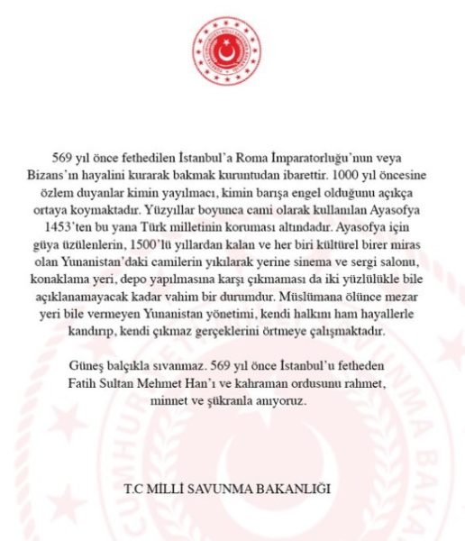 «Αποτελεί πλάνη να κοιτάει κανείς την Κωνσταντινούπολη, που κατακτήθηκε πριν από 569 χρόνια, ονειρευόμενος τη Ρωμαϊκή Αυτοκρατορία ή το Βυζάντιο. Όσοι λαχταρούν (την εποχή) πριν από 1.000 χρόνια, ας ξεκαθαρίσουν ποιος έχει επεκτατικές βλέψεις και ποιος είναι εμπόδιο στην ειρήνη. Η Αγία Σοφία, η οποία χρησιμοποιείται ως τέμενος επί αιώνες, βρίσκεται υπό την προστασία του τουρκικού έθνους από το 1453», αναφέρει με δημοσίευμά του το Υπουργείο Εθνικής Άμυνας.