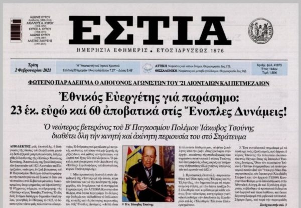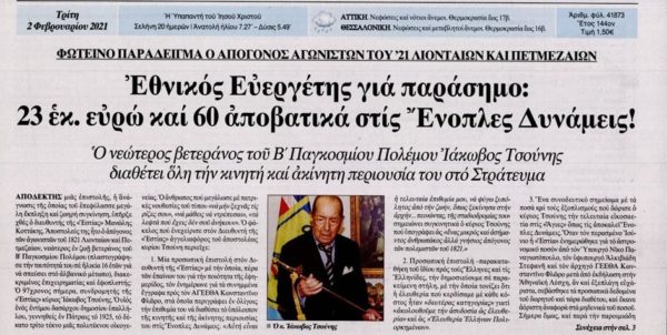 Συνδρομητής της εφημερίδας «ΕΣΤΙΑ», αυτός ο ιδιαίτερος και αξιοθαύμαστος Έλληνας, απόγονος ηρώων της επανάστασης του 1821, συνεχιστής της παράδοσης των μεγάλων ευεργετών του Ελληνισμού, αφήνει 23 εκατ. ευρώ για την άμυνα της πατρίδας και 60 αποβατικά σκάφη (αμφίβιων επιχειρήσεων).