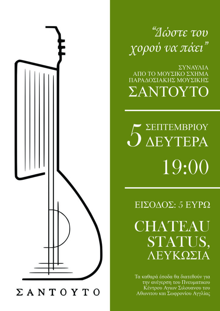 Με τίτλο «Δώστε του χορού να πάει», διοργανώνεται συναυλία από το μουσικό σχήμα παραδοσιακής μουσικής ΣΑΝΤΟΥΤΟ, στις 5 Σεπτεμβρίου στις 19:00, στο Chateau Status, στη Λευκωσία.