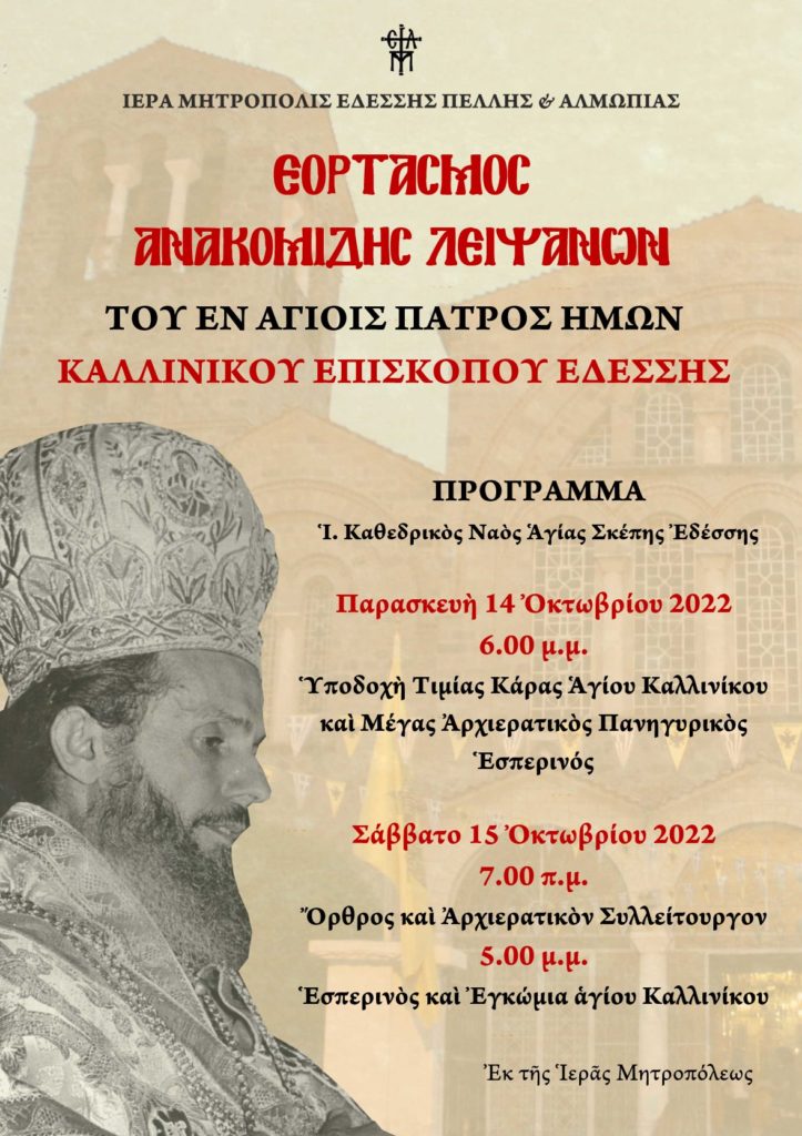 Ο Σεβασμιώτατος κ. Ιερόθεος είχε αναφερθεί παλαιότερα σε δύο γνωρίσματα του αγίου Καλλινίκου Εδέσσης:
