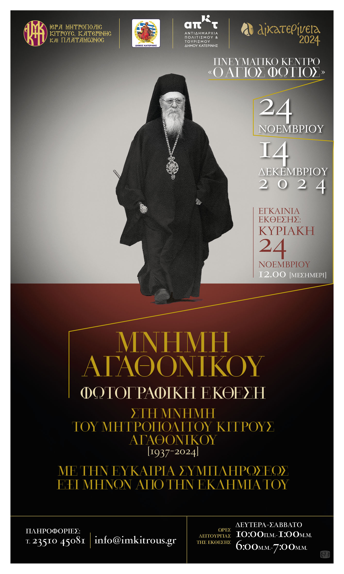 Με την ευκαιρία συμπληρώσεως έξι μηνών από την εκδημία του Μητροπολίτου Κίτρους Αγαθονίκου (1937 -2024), την Κυριακή 24 Νοεμβρίου, ώρα 12:00 μ.μ. εγκαινιάζεται η φωτογραφική έκθεση με τίτλο «ΜΝΗΜΗ ΑΓΑΘΟΝΙΚΟΥ», στο Πνευματικό Κέντρο «Ο Άγιος Φώτιος»