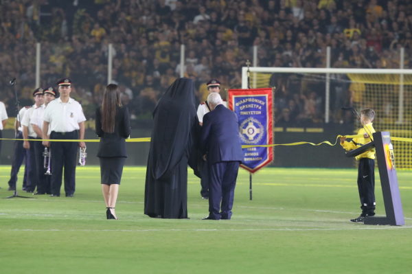 Οι σημαίες της Ελλάδας και της ΑΕΚ τοποθετήθηκαν αριστερά και δεξιά στον αγωνιστικό χώρο, ακούστηκε ο χαιρετισμός του Οικουμενικού Πατριάρχη Βαρθολομαίου και στη συνέχεια ο Δημήτρης Μελισσανίδης καταχειροκροτούμενος μπήκε στο γήπεδο για τον λόγο του κόβοντας την κορδέλα. Μεταξύ άλλων ανέφερε πως «απόψε η ΑΕΚ ιδρύεται ξανά» και ολοκλήρωσε λέγοντας: «Τιμή και Δόξα στην ΑΕΚ! Ζήτω η ΑΕΚ».