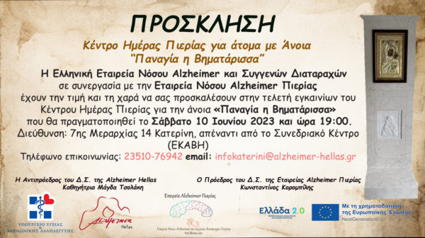 Η Ελληνική Εταιρεία Νόσου Αλτσχάιμερ και Συγγενών Διαταραχών – Θεσσαλονίκη σε συνεργασία με την Εταιρεία Νόσου Αλτσχάιμερ και Συγγενών Διαταραχών Πιερίας, έχουν αναλάβει την υλοποίηση ενός Κέντρου Ημέρας για την άνοια στην Περιφερειακή Ενότητα Πιερίας, στα πλαίσια του Προγράμματος Δημοσίων Επενδύσεων – Ταμείο Ανάκαμψης και Ανθεκτικότητας.