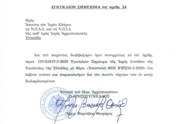 Εγκύκλιο σημείωμα απέστειλε η Ιερά Αρχιεπισκοπή Αθηνών προς όλους τους ιερους ναούς, ώστε να λάβουν γνώση του χθεσινού ΦΕΚ προσωρινής απαγόρευσης Ιερών Ακολουθιών, μέσα στο οποίο όμως υπήρχε μια παράγραφος που άνοιξε ένα παράθυρο στην ελπίδα.