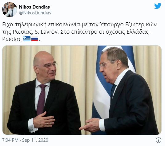 Τηλεφωνική επικοινωνία με τον Ρώσο ομόλογό του, Σεργκέι Λαβρόφ, είχε ο υπουργός Εξωτερικών Νίκος Δένδιας. Στο επίκεντρο της επικοινωνίας βρέθηκαν οι διμερείς σχέσεις μεταξύ της Ελλάδας και της Ρωσίας, σύμφωνα με ανάρτηση του υπουργείου Εξωτερικών στο Twitter.