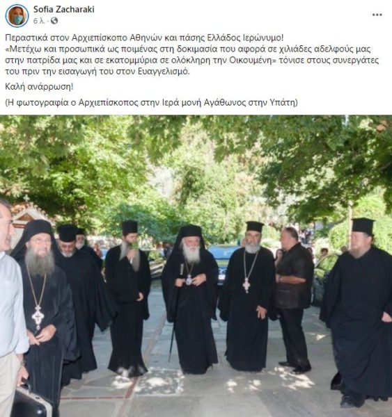 «Περαστικά στον Αρχιεπίσκοπο Αθηνών και πάσης Ελλάδος Ιερώνυμο! «Μετέχω και προσωπικά ως ποιμένας στη δοκιμασία που αφορά σε χιλιάδες αδελφούς μας στην πατρίδα μας και σε εκατομμύρια σε ολόκληρη την Οικουμένη» τόνισε στους συνεργάτες του πριν την εισαγωγή του στον Ευαγγελισμό. Καλή ανάρρωση!», γράφει, συνοδεύοντας την ανάρτηση με την φωτογραφία που βλέπετε και είναι τραβηγμένη από παλαιότερη επίσκεψη του Αρχιεπισκόπου στην Ιερά Μονή Αγάθωνος στην Υπάτη.