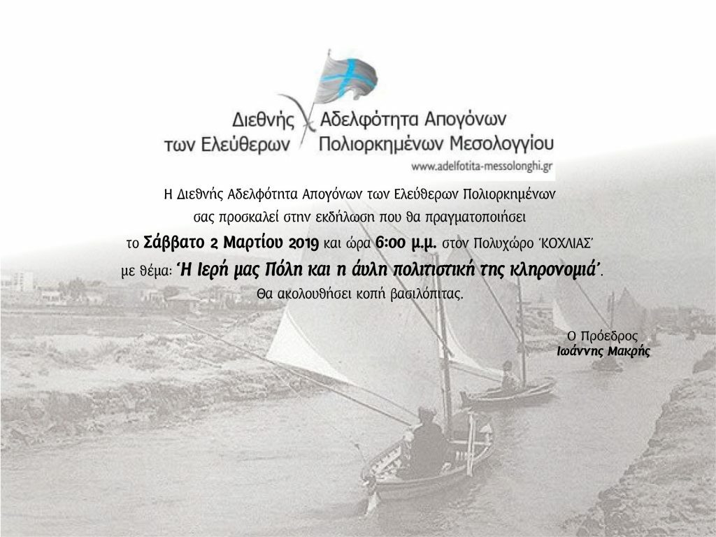 Η Διεθνής Αδελφότητα Απογόνων των Ελεύθερων Πολιορκημένων, μάς προσκαλεί στην εκδήλωση που θα πραγματοποιήσει το Σάββατο 2 Μαρτίου 2019 και ώρα 6:00 μ.μ. στον Πολυχώρο ‘ΚΟΧΛΙΑΣ’ στο Μεσολόγγι με θέμα: ‘Η Ιερή μας Πόλη και η άυλη πολιτιστική της κληρονομιά’.