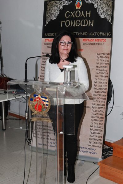 Η Σχολή Γονέων – Ανοικτό Πανεπιστήμιο Κατερίνης φιλοξένησε τρεις αξιόλογους ομιλητές την Δευτέρα 6 Φεβρουαρίου 2023. Τον Αρχιπλοίαρχο ε. α. Αντιπρόεδρο του Ελληνικού Ινστιτούτου Ναυτικής Ιστορίας (ΕΛ.Ι.Ν.ΙΣ.) κ. Λεωνίδα Τσιαντούλα, την Συγγραφέα – Ερευνήτρια Ναυτικής Ιστορίας κ. Κρίστυ Εμίλιο Ιωαννίδου και τον Συγγραφέα – Ιστορικό Ερευνητή κ. Δημήτρη Γκαλών. Το ειδικό θέμα της εκδήλωσης ήταν το: «Τα Ελληνικά υποβρύχια στον Β’ Παγκόσμιο Πόλεμο».