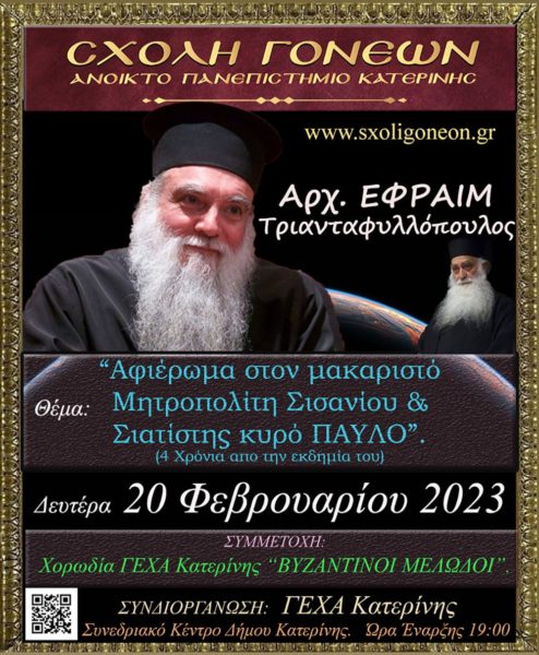 Η επόμενη εκδήλωση θα πραγματοποιηθεί την Δευτέρα 20 Φεβρουαρίου 2023 με επίσημο ομιλητή και καλεσμένο τον πρωτοσύγγελο της Ιεράς Μητροπόλεως Φθιώτιδος Αρχιμανδρίτη π.Εφραίμ Τριανταφυλλόπουλο και θέμα της ομιλίας του: «Αφιέρωμα στον μακαριστό Μητροπολίτη Σισανίου & Σιατίστης κυρό ΠΑΥΛΟ» με αφορμή τα 4 χρόνια από την εκδημία του. Την έναρξη της εκδήλωσης θα ανοίξει η χορωδία της ΓΕΧΑ Κατερίνης «ΒΥΖΑΝΤΙΝΟΙ ΜΕΛΩΔΟΙ».
