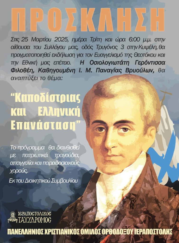 Eκδήλωση για τον Ευαγγελισμό της Θεοτόκου και την Εθνική Eπέτειο της Ελληνικής Επανάστασης του 1821 θα πραγματοποιηθεί στις 25 Μαρτίου 2025, ημέρα Τρίτη και ώρα 6:00 μ.μ. στην αίθουσα του Πανελληνίου Χριστιανικού Ομίλου Ορθοδόξου Ιεραποστολής Συλλόγου, οδός Τρυγόνος 3 στην Κυψέλη.