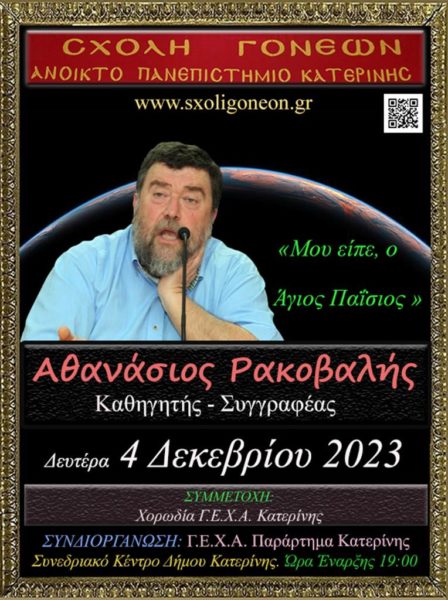 Για τον Άγιο Παΐσιο όπως τον γνώρισε θα μιλήσει την Δευτέρα 4 Δεκεμβρίου 2023 στις 19:00 στo πλαίσιο των εκδηλώσεων της Σχολής Γονέων – Ανοικτό Πανεπιστήμιο Κατερίνης ο φυσικός, Αγιογράφος και καθηγητής κ. Αθανάσιος Ρακοβαλής.