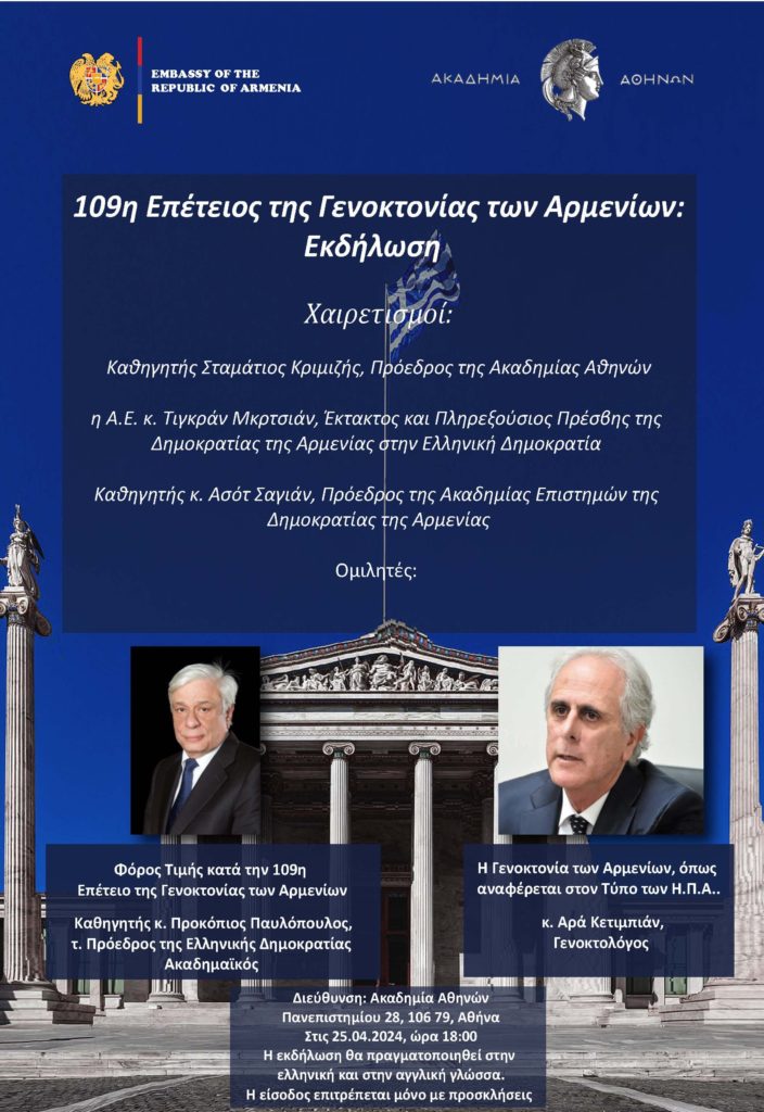 Εκδήλωση μνήμης για την 109η Επέτειο της Γενοκτονίας των Αρμενίων συνδιοργανώνουν η Ακαδημία Αθηνών και η Πρεσβεία της Αρμενίας στην Ελληνική Δημοκρατία την Πέμπτη 25 Απριλίου 2024 και ώρα 18:00 στο Μέγαρο της Ακαδημίας Αθηνών (Αίθουσα Τελετών-Πανεπιστημίου 28).