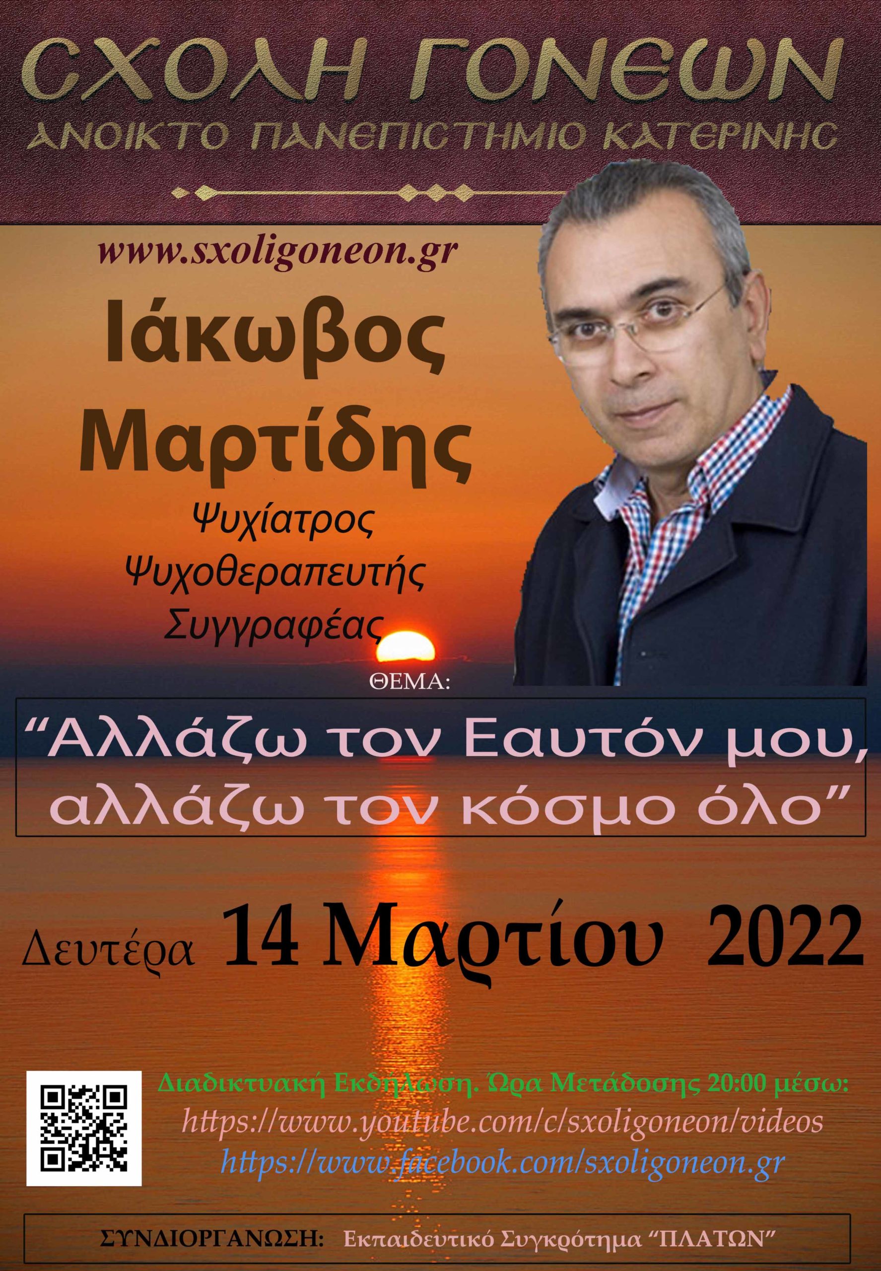 “Αλλάζω τον Εαυτόν μου, αλλάζω τον κόσμο όλο” το θέμα της τελευταίας εκδήλωσης της Σχολής Γονέων – Ανοικτό Πανεπιστήμιο Κατερίνης για την Ακαδημαϊκή Περίοδο 2021-2022 με καλεσμένο τον Ψυχίατρο, Ψυχοθεραπευτή και Συγγραφέα κ. Ιάκωβο Μαρτίδη.