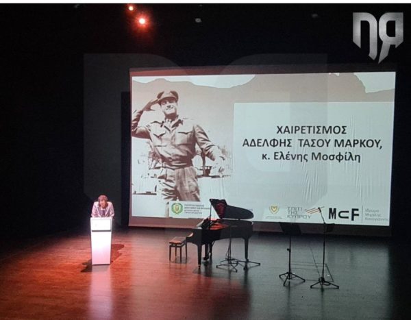 Στην εκδήλωση προχώρησε σε ομιλία η αδελφή του Τάσου Μάρκου, Ελένη Μοσφίλη, ενώ συγκινητική στιγμή στην εκδήλωση, ήταν και η ομιλία του συμμαθητή του ήρωα από την Σχολή Ευελπίδων.
