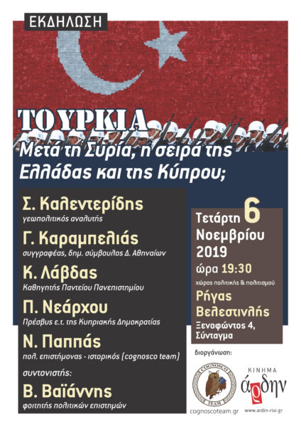 Επίκαιρη εκδήλωση διοργανώνουν την Τετάρτη 6 Νοεμβρίου το Άρδη και η ιστοσελίδα cognosco team με θέμα: “«Τουρκία: Μετά την Συρία, η σειρά της Ελλάδας και της Κύπρου;».