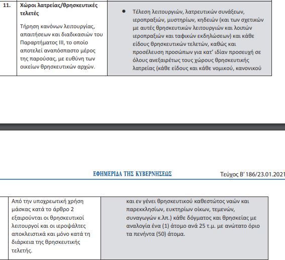 Η τέλεση λειτουργιών, λατρευτικών συνάξεων, ιεροπραξιών, μυστηρίων, κηδειών (και των σχετικών με αυτές λειτουργιών και λοιπών ιεροπραξιών και ταφικών εκδηλώσεων) και κάθε είδους θρησκευτικών τελετών, καθώς και προσέλευση προσώπων για κατ’ ιδίαν προσευχή σε όλους ανεξαιρέτως τους χώρους θρησκευτικής λατρείας θα γίνεται με αναλογία ένα άτομο ανά 25 τ.μ. με ανώτατο όριο τα 50 άτομα. Η συμμετοχή επιτρέπεται με μάσκα υποχρεωτικά. Οι μόνοι που εξαιρούνται από αυτό είναι οι θρησκευτικοί λειτουργοί και οι ιεροψάλτες.