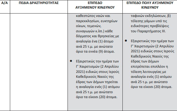 Συγκεκριμένα για τους Ιερούς Ναούς στο επίπεδο “αυξημένοι κινδύνου” οι πιστοί μπορούν να προσέρχονται για ατομική προσευχή καθώς και να τελεστούν οι Ακολουθίες με ανώτατο όριο τα 9 άτομα. Ενώ στο επίπεδο “πολύ αυξημένου κινδύνου” όλες οι Ακολουθίες τελούνται κεκλεισμένων των θυρών, αποκλειστικά και μόνο από τους θρησκευτικούς λειτουργούς