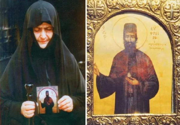 Γύρισα καί τόν εἶδα· Ψηλός, ἀσκητικός, πολύ μελαχροινός, μάτια μικρά στρογγυλά μέ ἐλαφρές ρυτίδες στήν ἄκρη, μακρυά γένεια πού ἔφθαναν ἕως τόν λαιμόν, μέ ὅλη τή μοναχική ἀμφίεσι. Στό ἀριστερό χέρι κρατοῦσε ἕνα φῶς ὑπερφυσικό καί μέ τό δεξί εὐλογοῦσε. Ἡ ψυχή μου πλημμύρισε ἀπό χαρά. Αἰσθάνθηκα τήν παρουσία του πολύ γνώριμη. Πῆρα θάρρος καί δύναμι κι εἶπα: