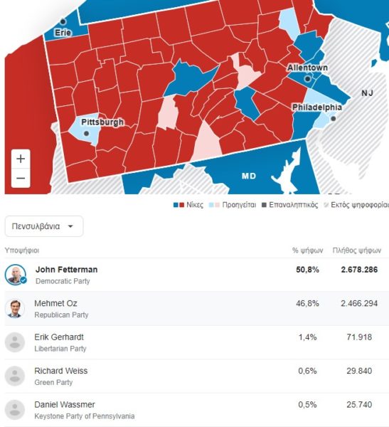 Η νίκη του Φιλέλληνα Φέτερμαν, ο οποίος διαδέχεται τον συνταξιούχο Γερουσιαστή του GOP Πατ Τουμεϊ, προσφέρει άλλη μια έδρα στη Γερουσία στους Δημοκρατικούς του Τζο Μπάιντεν, αυξάνοντας τις πιθανότητές τους να τη διατηρήσουν υπό τον έλεγχό τους για άλλη μια διετία.