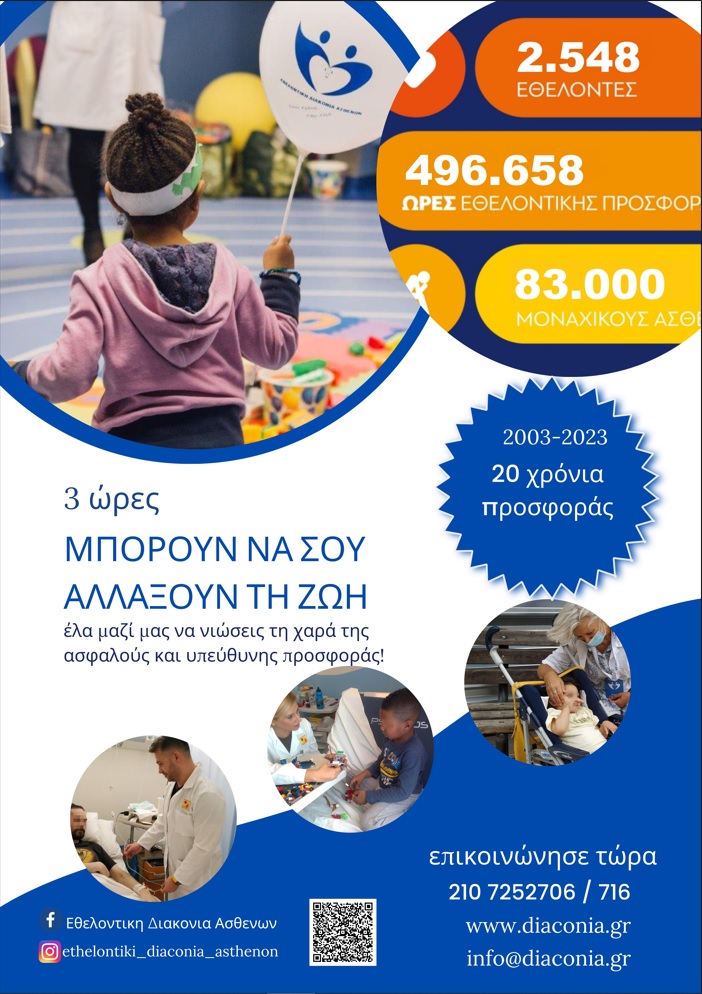 Με σύνθημα “3 ώρες μπορούν να σου αλλάξουν τη ζωή “, η Εθελοντική Διακονία Ασθενών διοργανώνει εκτάκτως καινούργιο εκπαιδευτικό κύκλο νέων εθελοντών για να ενταχθούν στη μεγάλη οικογένεια της ΔΙΑΚΟΝΙΑΣ, στις 23 και 25 Οκτωβρίου 2023.