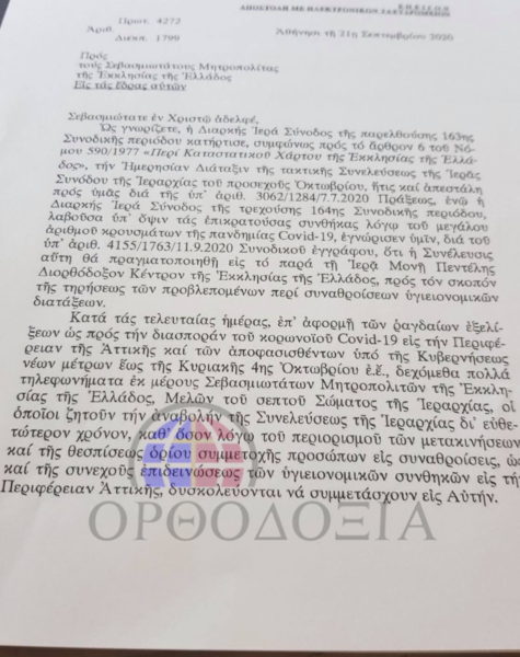 Στην επιστολή, που εστάλη προς τους Ιεράρχες, δίδονταν προθεσμία έως την Πέμπτη 24 Σεπτεμβρίου για να υποβάλλουν τις απόψεις τους.