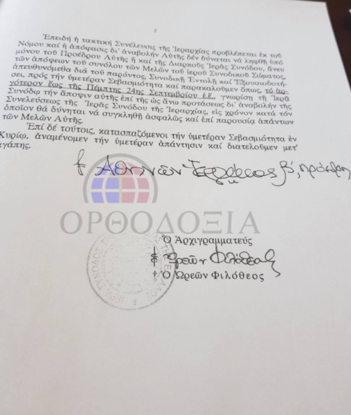 Στην επιστολή, που εστάλη προς τους Ιεράρχες, δίδονταν προθεσμία έως την Πέμπτη 24 Σεπτεμβρίου για να υποβάλλουν τις απόψεις τους.