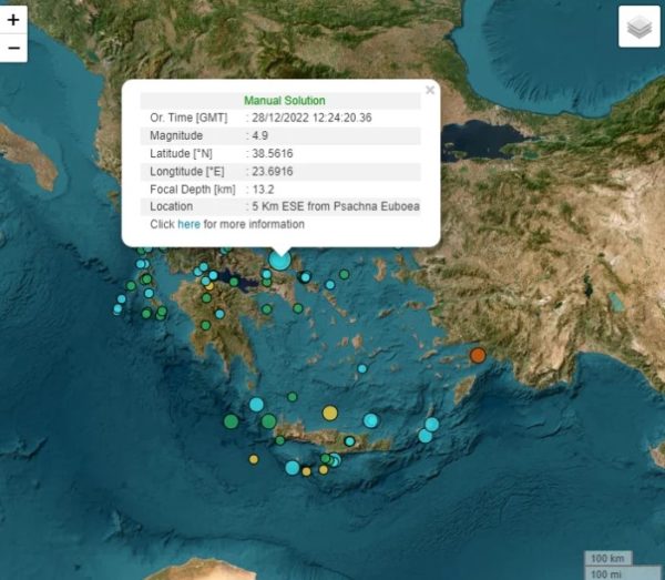 Σύμφωνα με την εκτίμηση του Γεωδυναμικού Ινστιτούτου, ο σεισμός είναι 4.9 Ρίχτερ, το εστιακό βάθος είναι στα 13,2 χλμ ενώ το επίκεντρο 5 χλμ ανατολικά των Ψαχνών Ευβοίας.
