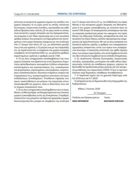 Εκθόθηκε το ΦΕΚ Αρ. Φύλ. 2111 ΤΕΥΧΟΣ ΔΕΥΤΕΡΟ της 2ας Ιουνίου 2020 “Επιβολή προσωρινών μέτρων στους θρησκευτικούς χώρους λατρείας για την προστασία της δημόσιας υγείας έναντι του κορωνοϊού COVID-19, για το χρονικό διάστημα από 6.6.2020 έως και 9.7.2020”.