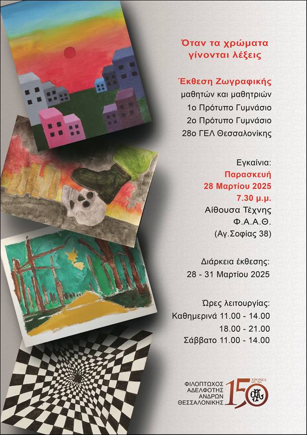 Η Φιλόπτωχος Αδελφότης Ανδρών Θεσσαλονίκης προσκαλεί στα εγκαίνια της έκθεσης ζωγραφικής μαθητών και μαθητριών του 1ου Πρότυπου Γυμνασίου, του 2ου Πρότυπου Γυμνάσιου και του 28ου ΓΕΛ Θεσσαλονίκης, η οποία θα λάβει χώρα την Παρασκευή 28 Μαρτίου 2025, στις 7.30 μ.μ., στην Αίθουσα Τέχνης της Φιλοπτώχου Αδελφότητος Ανδρών Θεσσαλονίκης.