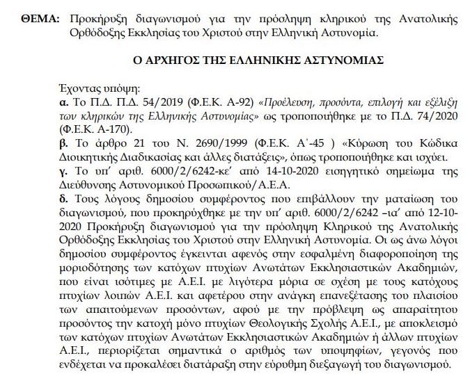 Ματαιώνεται ο διαγωνισμός που είχε προκηρυχθεί με την υπ’ αριθ. 6000/2/6242 –ια’ από 12-10-2020 Προκήρυξη για την πρόσληψη Κληρικού στην Ελληνική Αστυνομία.