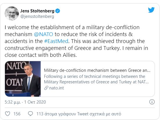 «Μετά από μια σειρά τεχνικών συναντήσεων μεταξύ των Στρατιωτικών Αντιπροσώπων της Ελλάδας και της Τουρκίας στα κεντρικά γραφεία του ΝΑΤΟ στις Βρυξέλλες, δημιουργήθηκε διμερής στρατιωτικός μηχανισμός αποκλιμάκωσης την Πέμπτη (1 Οκτωβρίου 2020). Ο μηχανισμός έχει σχεδιαστεί για τη μείωση του κινδύνου συμβάντων και ατυχημάτων στην Ανατολική Μεσόγειο. Περιλαμβάνει τη δημιουργία μιας ανοιχτής γραμμής μεταξύ Ελλάδας και Τουρκίας, για τη διευκόλυνση της αποκλιμάκωσης στη θάλασσα ή στον αέρα.