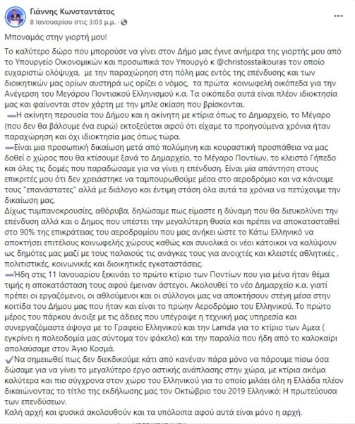 “Εγκαταστάσεις τις οποίες παραδώσαμε σε αγαστή συνεργασία με την κυβέρνηση προκειμένου να πραγματοποιηθεί το μεγάλο έργο της επένδυσης του Ελληνικού. Τότε δήλωσα ότι σε καμία περίπτωση δεν είναι δυνατόν τόσο ο Δήμος όσο και οι Πόντιοι να μην επιστρέψουν ξανά στην ιστορική τους κοιτίδα, αυτή τη φορά στα κοινωφελή οικόπεδα που θα έδινε ο επενδυτής στο ελληνικό δημόσιο προκειμένου να φτιάξουμε το δημαρχείο μας, το εργοτάξιό μας, τις αθλητικές – πολιτιστικές μας εγκαταστάσεις και φυσικά το πιο σημαντικό απ’ όλα τα κτίρια της Ένωσης Ποντίων Σουρμένων”, υπογραμμίζει ο κ. Γιάννης Κωνσταντάτος.
