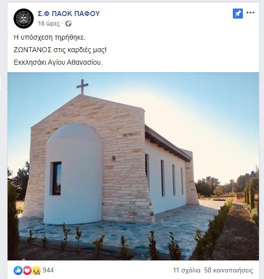 Ο Σύλλογος Φιλάθλων Πάφου, είχε υποσχεθεί πως θα μεριμνήσει για την ανέγερση μιας μικρής εκκλησίας στη μνήμη του αδικοχαμένου οπαδού του ΠΑΟΚ, Νάσου Κωνσταντίνου, που έχασε την ζωή του πριν από τρία χρόνια, στην προσπάθεια του να ξεφύγει από επίθεση κουκουλοφόρων.