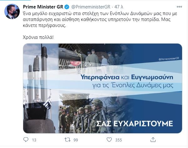“Ένα μεγάλο ευχαριστώ στα στελέχη των Ενόπλων Δυνάμεών μας που με αυταπάρνηση και αίσθηση καθήκοντος υπηρετούν την πατρίδα. Μας κάνετε περήφανους. Χρόνια πολλά!” ανέφερε ο πρωθυπουργός της χώρας κ. Κυριάκος Μητσοτάκης για την Ημέρα των Ελληνικών Ενόπλων Δυνάμεων σε ανάρτησή του στο twitter.