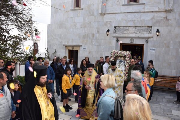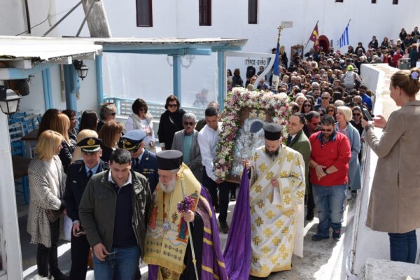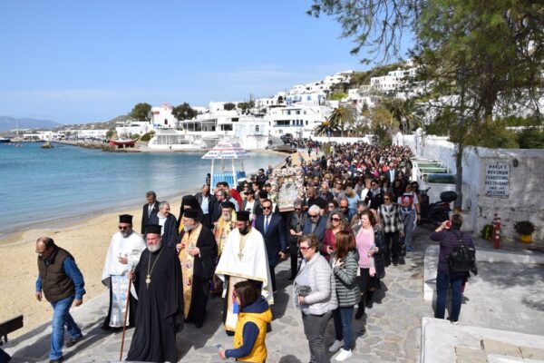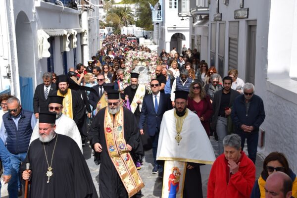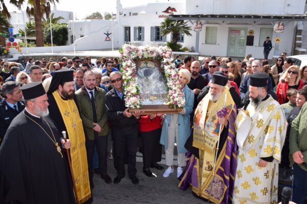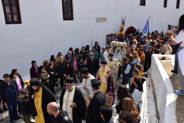 Η Μύκονος, ηλιόεσσα, ανθοφορούσα από την άνοιξη και γαληνιώσα, εδέχθη την ευλογία της Παναγίας, καθ’ όλη τη διάρκεια της λιτανευτικής καθόδου της Αγίας και Πανσέπτου Εικόνος της προς τον Ιερό Ναό της Αγίας Κυριακής, στον οποίο θα παραμείνει, κατά το επιχώριο έθος, μέχρι το Σάββατο του Λαζάρου.