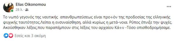 “Το νωπό γεγονός της ναυτικής απανθρωπεύσεως είναι προϊόν της προδοσίας της ελληνικής ψυχικής ταυτότητος. Λείπει η ενσυναίσθηση, αλλά κυρίως η μετάνοια. Ρύπος έπνιξε την ψυχές. Ακούσθηκαν λέξεις, που παραπέμπουν στις λέξεις του αρχαίου Κάιν. Τόσο οπισθοδρομήσαμε”, έγραψε στον προσωπικό του λογαριασμό σε μέσο κοινωνικής δικτύωσης ο κ. Οικονόμου.