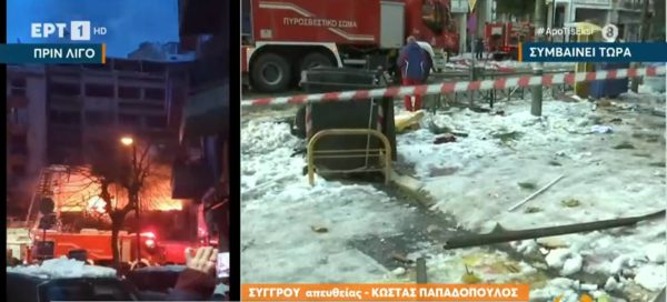 Το τοπίο πάντως, στην αρχή της Συγγρού, μετά την έκρηξη μοιάζει με βομβαρδισμένο: Οι ζημιές στο κτίριο που έγινε η έκρηξη είναι μεγάλες, τζάμια έχουν σπάσει τόσο στο ίδιο το κτίριο όσο και σε γειτονικά, ταμπέλες καταστημάτων διαλύθηκαν.