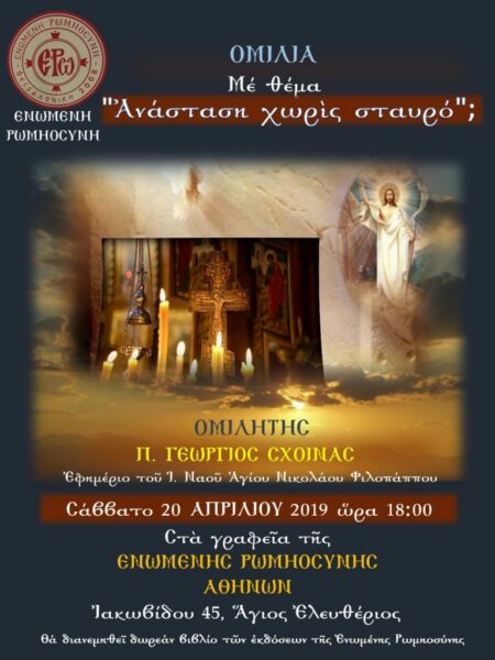 Ὁμιλητὴς τῆς ἐκδήλωσης θὰ εἶναι ὁ π. Γεώργιος Σχοινᾶς, ἐφημέριος τοῦ Ἱ.Ναοῦ Ἁγίου Νικολάου Φιλοπάππου, μὲ θέμα: “Ἀνάσταση χωρὶς σταυρό”; Κατὰ τὴν διάρκεια τῆς ἐκδήλωσης θὰ διανεμηθεῖ δωρεὰν σὲ ὅλους τοὺς παρευρισκόμενους βιβλίο τῶν ἐκδόσεων τῆς Ἑνωμένης Ρωμηοσύνης.