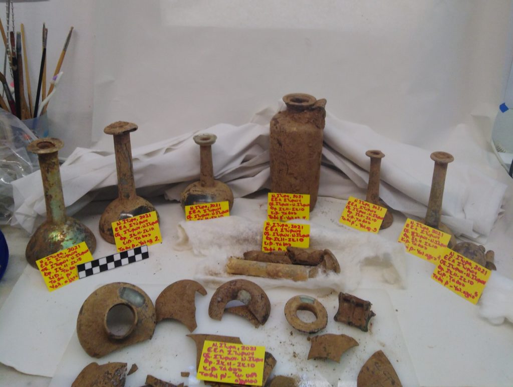 Τα κινητά ευρήματα του τάφου, έχουν μεταφερθεί στο Τμήμα Συντήρησης του Αρχαιολογικού Μουσείου Ερέτριας, προκειμένου να συντηρηθούν και να τεκμηριωθεί η χρονολόγηση τους. Καθώς τα πέντε υάλινα μυροδοχεία έχουν σωθεί ακέραια και αποτελούν μια ενότητα, από την οποία δύναται να εξαχθούν ενδιαφέροντα στοιχεία για την τυπολογία και την χρήση τους, η Εφορεία Αρχαιοτήτων Ευβοίας, ήδη προγραμματίζει την έκθεσή τους στο Αρχαιολογικό Μουσείο Καρύστου, όπου υπάρχει μια μικρή ενότητα από μυροδοχεία προερχόμενα από τη Ρωμαϊκή Νεκρόπολη της Καρύστου (θέση Ξάνεμο). Προς έκθεση και εξαγωγή σημαντικών πληροφοριών, αναφορικά με την επεξεργασία του χαλκού και την δημιουργία αγγείων υψηλής αισθητικής, προσφέρεται και ο χάλκινος κάλαθος, με το ανάγλυφο σώμα και την πλοχμοειδή λαβή, στις απολήξεις της οποίας, εκατέρωθεν, είναι αναρτημένα δυο λεπτά χάλκινα φύλλα, που αποδίδουν με ρεαλισμό τα φύλλα του κισσού.