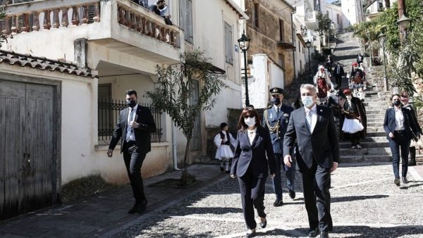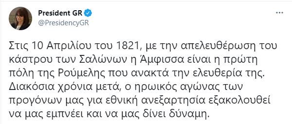 «Βρίσκομαι εδώ για να τιμήσω την επέτειο της απελευθέρωσης του Κάστρου των Σαλώνων. Η Άμφισσα είναι η πρώτη πόλη της Ρούμελης που εξεγέρθηκε το 1821 και η πρώτη που απελευθερώθηκε. Αν για τους αρχαίους προγόνους μας η Φωκίδα και το κέντρο των Δελφών ήταν ο «ομφαλός της γης», για τις γυναίκες και τους άντρες που πολέμησαν για την ελευθερία μας ήταν ο τόπος της θυσίας. Διακόσια χρόνια μετά την κήρυξη της Ελληνικής Επανάστασης, ο ηρωικός αγώνας των προγόνων μας για την αποτίναξη του τουρκικού ζυγού και την εθνική μας ανεξαρτησία μας δίνει έμπνευση και δύναμη».