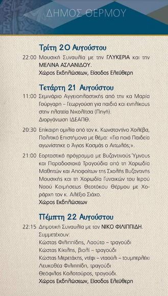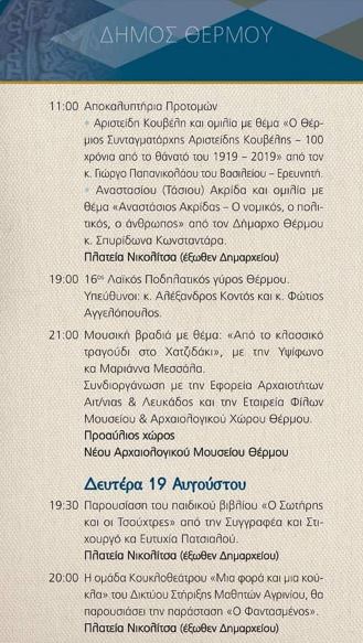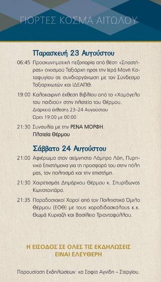 17/08/2019 17/08/2019 Ξεκίνησαν χθες οι εκδηλώσεις προς τιμήν του Αγίου Κοσμά του Αιτωλού στο Δήμο Θέρμου στην Αιτωλοακαρνανία. «Ο πολιτισμός αποτελεί προτεραιότητα της Δημοτικής Αρχής του Δήμου Θέρμου και κάθε εκδήλωση ετοιμάζεται από μια ομάδα έμπειρων συνεργατών. Το Θέρμο έχει καθιερωθεί ως ο δήμος με ξεχωριστές εκδηλώσεις ,συγκεντρώνοντας χιλιάδες επισκέπτες. Με την ίδια μεθοδικότητα και συλλογική δουλειά θα συνεχίσουμε...